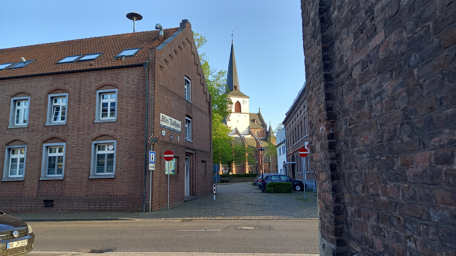 Zurück zur Heinsberger Straße, rechts ab zur Sittarder Straße, diese am Zebrastreifen überqueren und nach links zum Burgturm, vorbei am links- gelegenen 3. ehemaligen Wehrturm (Frankenturm) – nach rechts zum Burgturm– von hier aus zum Ausgangspunkt RATHAUS zurück.